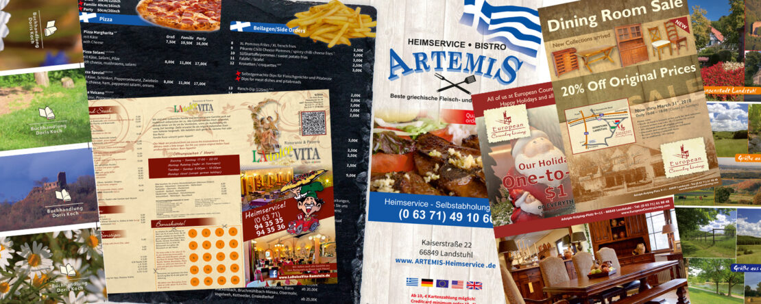 Briefpapiere, Visitenkarten, Flyer, Postkarten, Mappen, Kalender, Prospekte und Broschüren oder Kataloge. Auch Werbeartikel, Fahnen und Kugelschureiber können Sie über uns beziehen und sich jeder Zeit beraten lassen. Vieles geht auch overnight, wenn es mal eilig sein sollte.